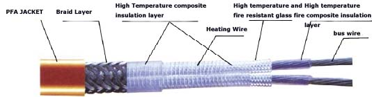 Принцип работы высокотемпературного нагревательного кабеля постоянной мощности HGL такой же, как у параллельного нагревательного кабеля постоянной мощности HBL, и его структура аналогична. Он может использоваться во взрывоопасных зонах Зона 1 и Зона 2 с взрывоопасными газовыми смесями в группах T3-T6. Основное отличие заключается в использовании никелированной многопроволочной проволоки для сердечника, никелированной медной проволоки для экранирующего слоя, высокотемпературного огнестойкого стекловолокна для внешней оболочки провода шины и политетрафторэтилена (PFA) для слоев изоляции и оболочки. Он может использоваться непрерывно при температурах до 260°C.